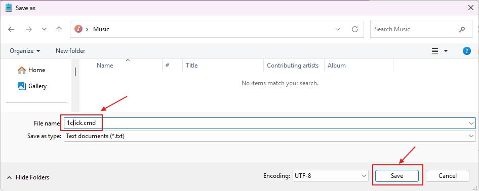 Sau đó lưu thành file batch với phần mở rộng .cmd và đặt tên tùy ý. Ở đây mình đặt là “1click.cmd”.